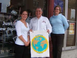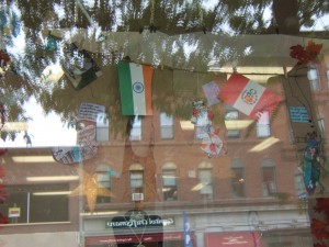 Gondwana: Students from Rundlett Middle School gave us a hand with clothes cut from paper bags. Pictures and flags are also hung to represent the countries Gondwana practices Fair Trade with.