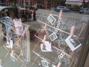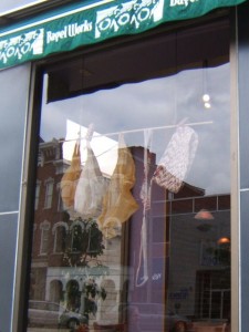 Project Laundry List is an event taking place in downtown Concord to promote the green advantages of using a clothesline. Creative displays have been hung at the Capital building and 13 businesses. In collaboration with Cyndi Rogers of Mariposa Designs, we worked on the design, construction, and installation of 5 displays: Bagel Works, Caffenio, Concord Camera, Gibson’s Bookstore, and Gondwana. Stay tuned to find out which window is the winner!