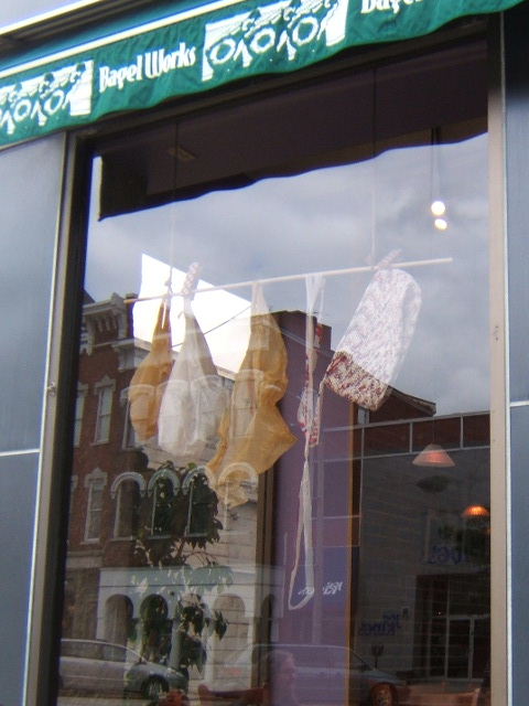 Bagel Works: Window on the left - your average plastic grocery bag… On the right - ANYTHING but ordinary bags woven from the plastic ones! Created by Crafty Kathy, these hardcore alternatives are available for purchase at KAZA.